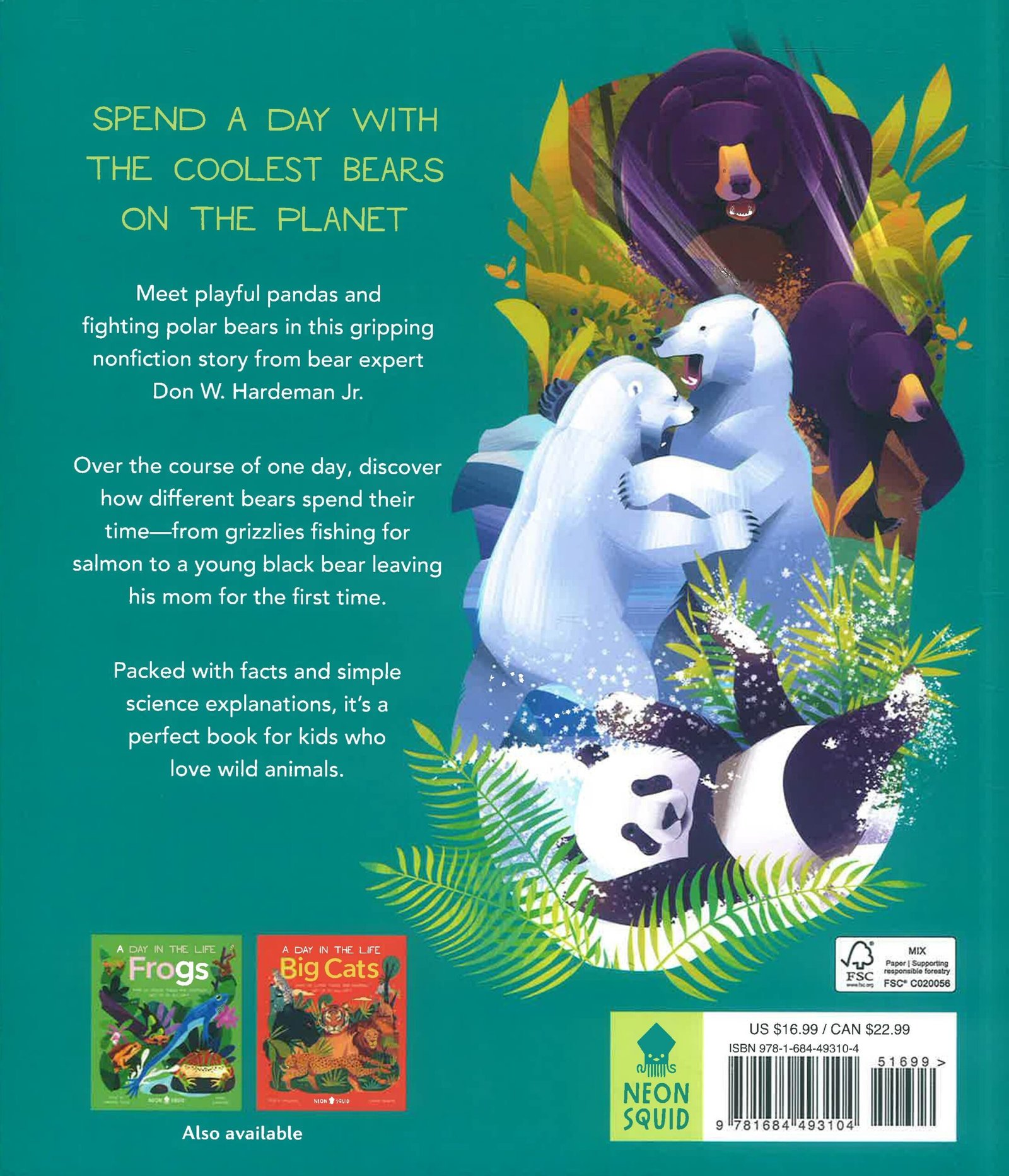 A Day in the Life: Bears is an educational and visually engaging picture book that gives young readers a glimpse into the daily habits of different bear species around the world. From polar bears to pandas, this book uses captivating photography and fun facts to explore how bears eat, sleep, play, and interact with their environment. The narrative is simple and accessible, perfect for early learners, while still packed with fascinating insights into the animal kingdom. Ideal for classrooms or bedtime reading, this book fosters curiosity about wildlife and promotes awareness of nature and animal conservation.